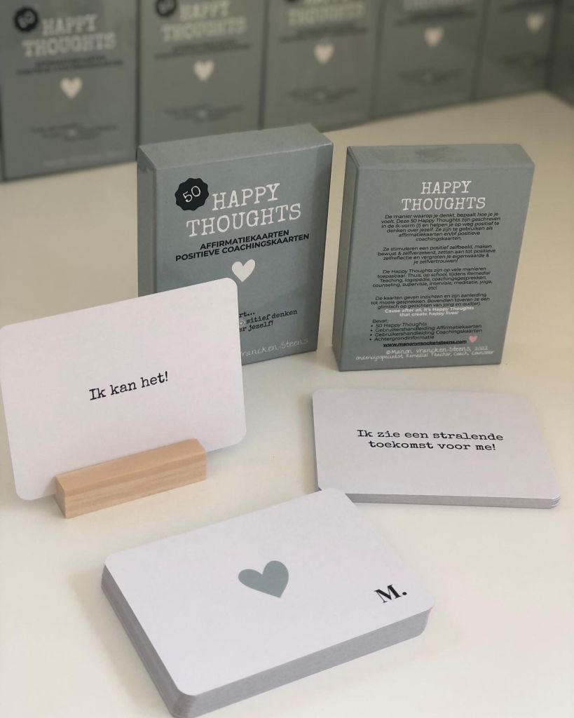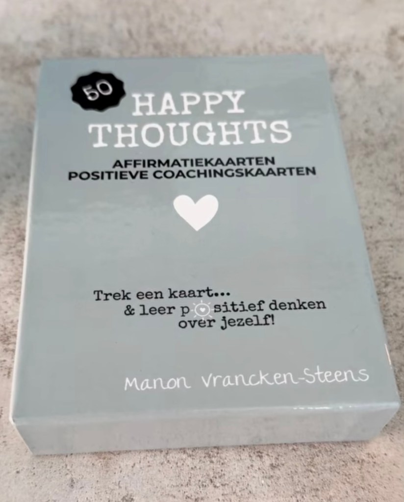 De manier waarop je denkt, bepaalt hoe je je voelt. Daarom bracht ik anderhalf jaar geleden een hele helpende set op de markt die je daar fantastisch mee kan helpen! 50 Happy Thoughts, die zijn verpakt in een heel stevig kartonnen doosje en zijn gedrukt op kwalitatief goed dik papier.